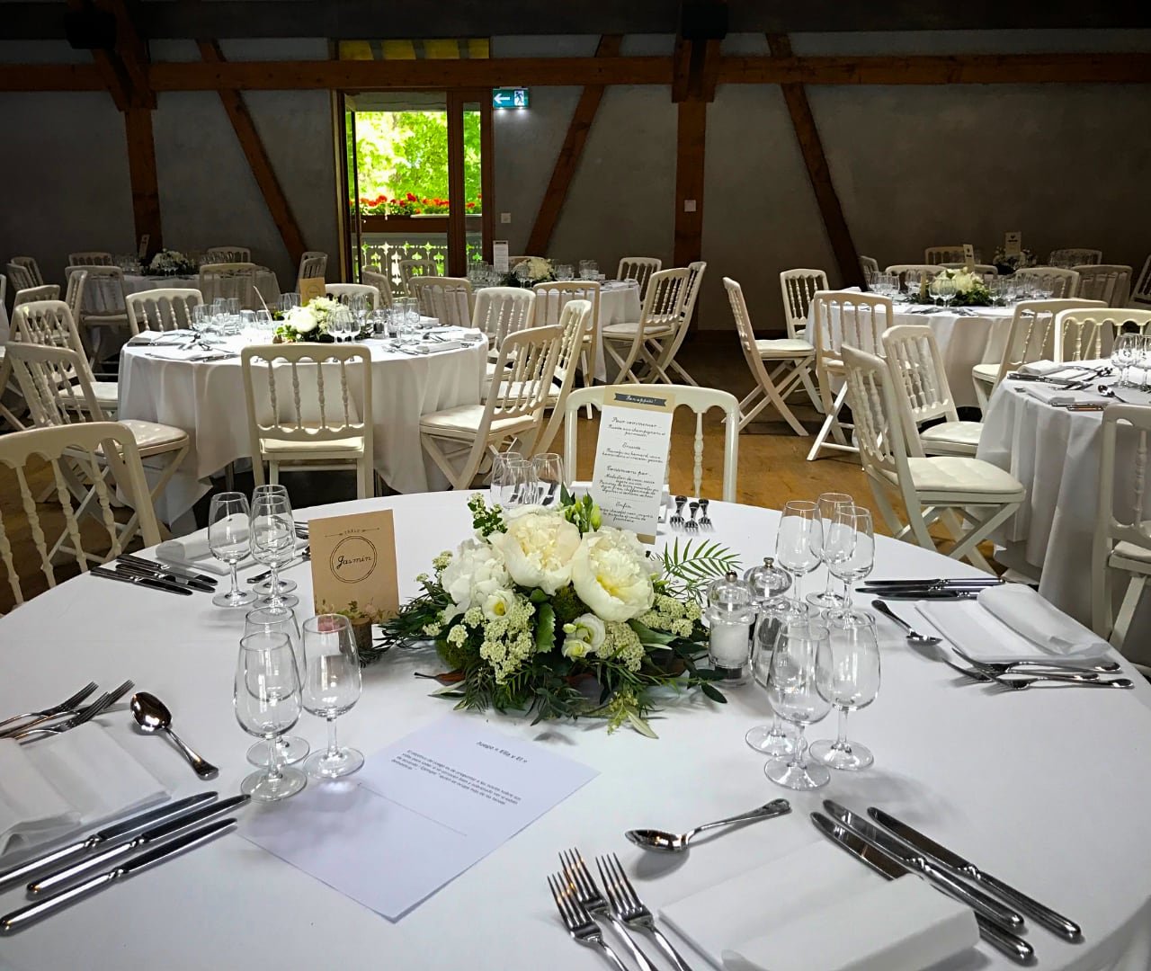 Le nappage et les serviettes sont à coordonner avec le traiteur ou un prestataire de location.