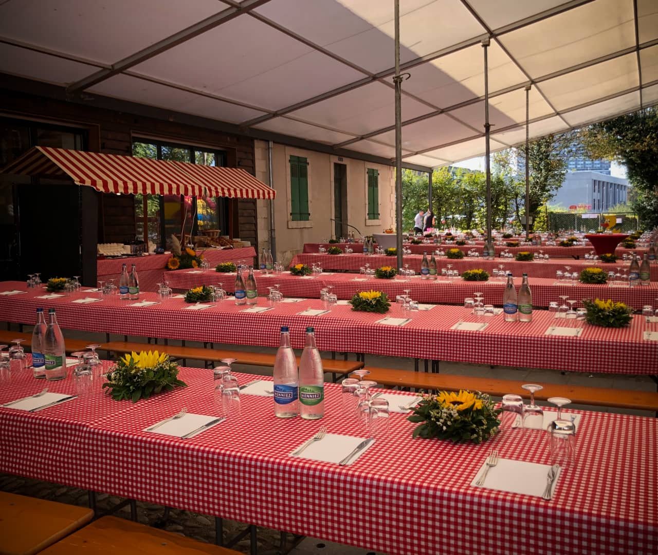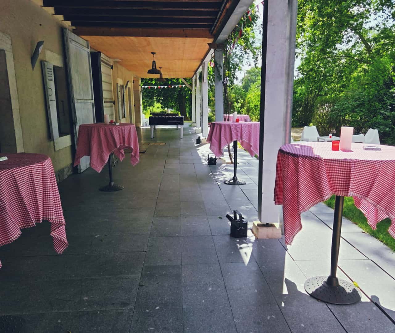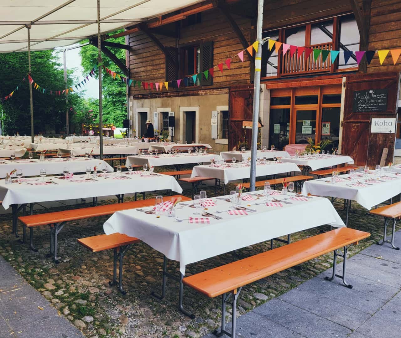 - Grandes tables rectangulaires et bancs
